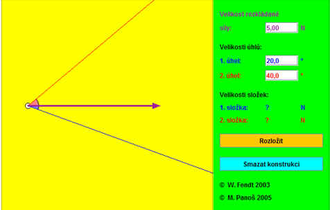 Zvoľte v aplete nasledujúce počiatočné podmienky: Velikost rozkládané síly (ktorú budete rozkladať na zložky): 5 N, Velikosti úhlů: úhel 1 = 20 stupňov, úhel 2 = 40 stupňov a stlačte Rozložit.
