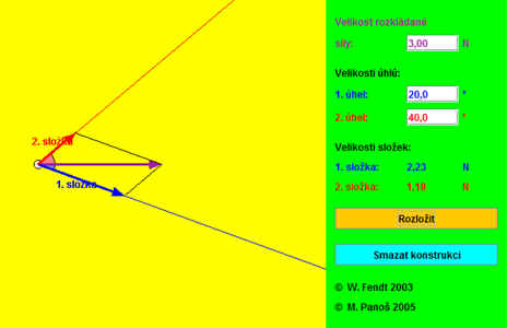V tejto úlohe ľubovoľne meňte veľkosť vektora a uhly pod ktorými ho budete rozkladať. Pozorujte pri tom tvar výsledného geometrického útvaru, veľkosť zložiek, ktoré dostanete a uhol, ktorý zvierajú. Nezabudnite pred zmenou údajov stlačiť Smazat konstrukcii.