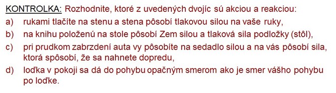 Formulovať 3. Newtonov pohybový zákon. Vysvetliť pojmy akcia a reakcia a napísať, čo platí pre sily akcie a reakcie z hľadiska veľkosti a smeru. Uviesť príklady na 3.NPZ.